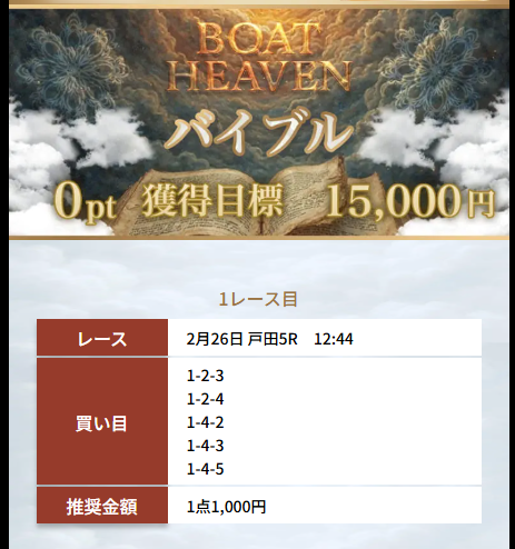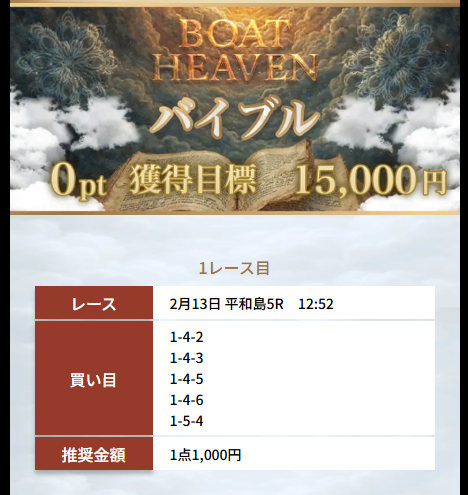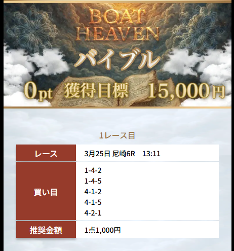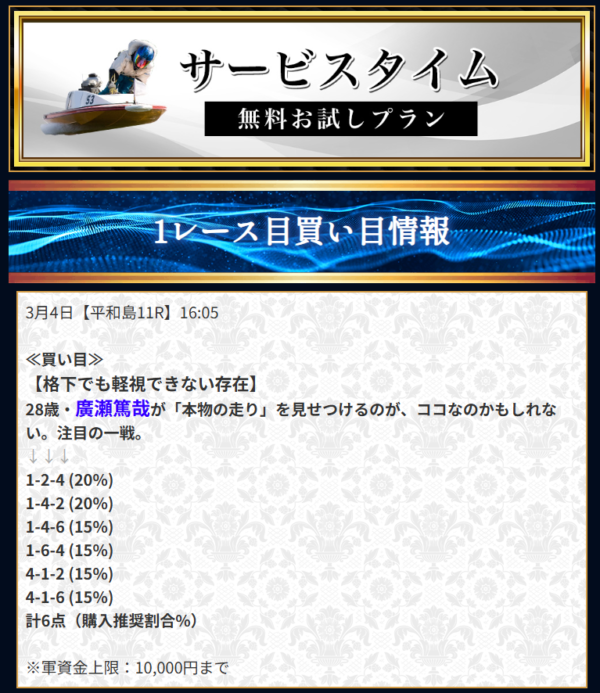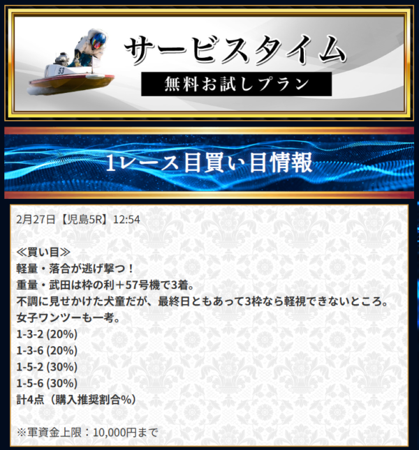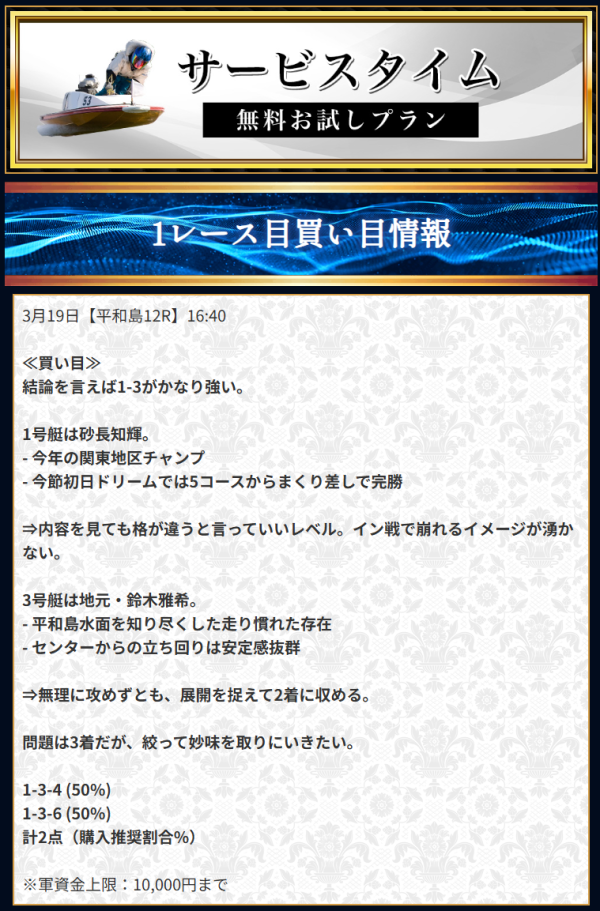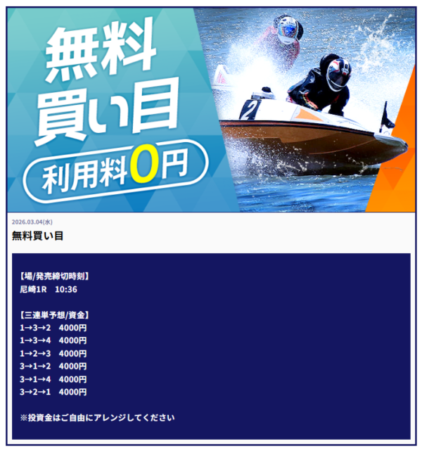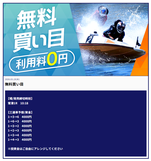 直近で良い口コミが多かったため無料会員登録。すぐにナイトハントで70.1倍が的中した。競艇は昔競艇場に1回行ったことがあるだけだったけど、再開しようかな。