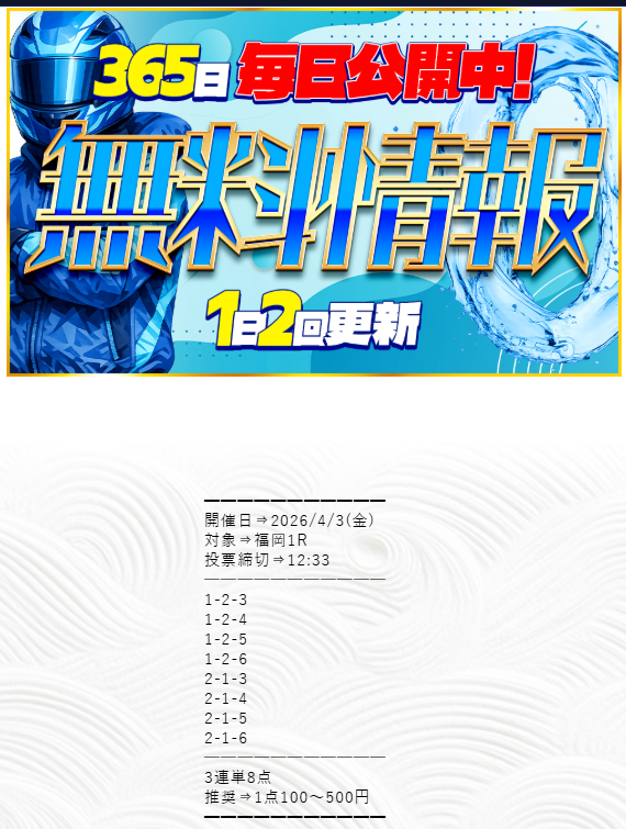 | 1位 | 競艇サンダーバード![]() ![]() | 低価格でも 高配当狙い | 直近3か月の 良い口コミ15件 | 無料予想を 週6日公開 | 先月の高配当 約121万円! | LINEで 無料登録 | 2024年9月に 優良掲載 |