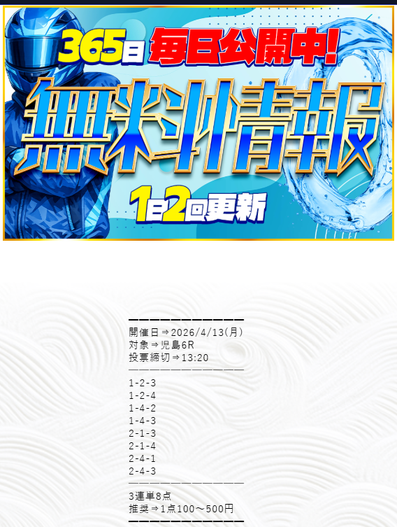 確かに登録してみたら福岡チャンピオンカップの記事がもう掲載されてた。 注目選手や根拠の解説もしっかりしていると思う。 その選手がレースに出る際は参考になりそうですね。 それに無料情報も4/9のナイター…