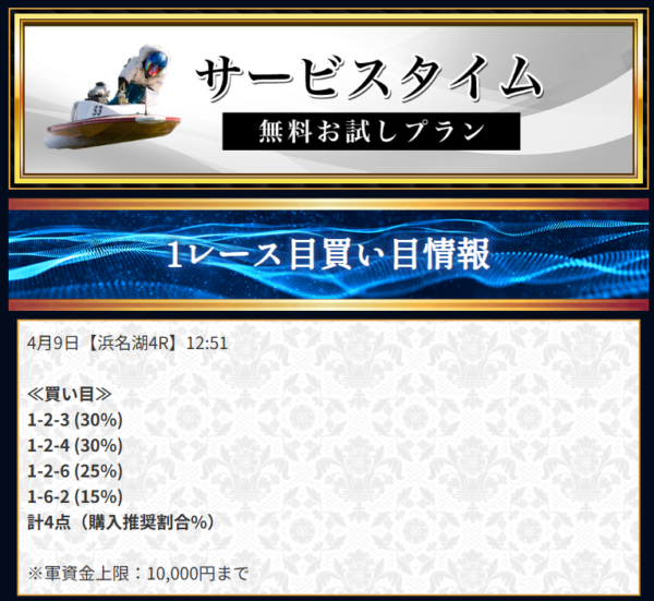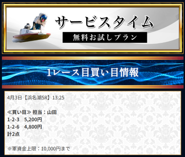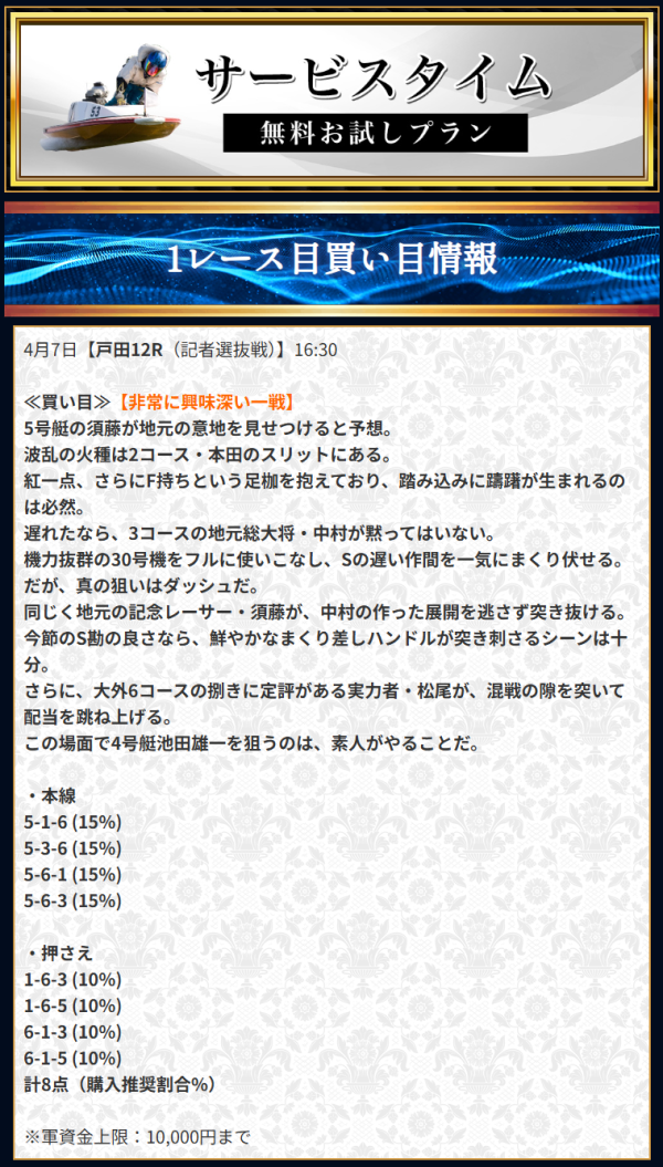 | 無料予想 | 10レース分の回収率が117%※2 週6日、1日2レース分を公開 |