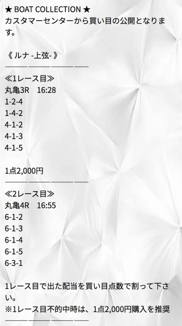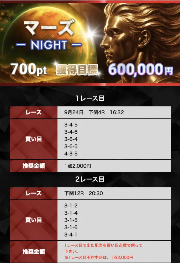 三連単1レースの買い目提供で、払戻金3万円を狙えるので、軍資金が少なくても試しやすいぞ。