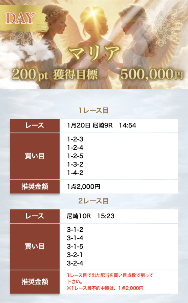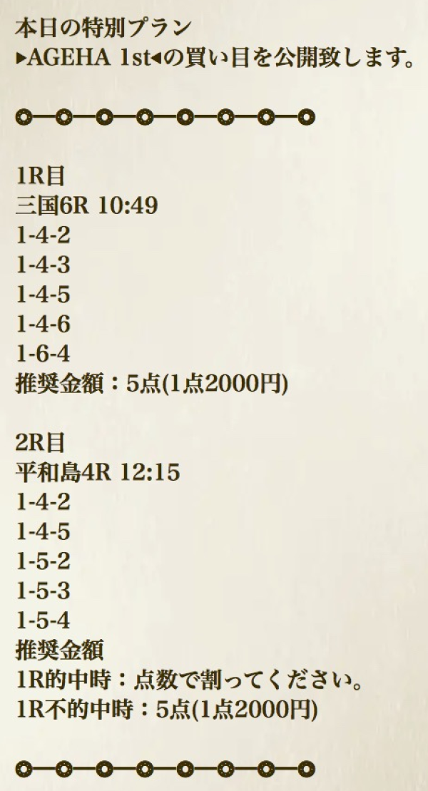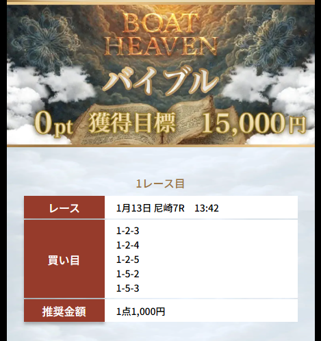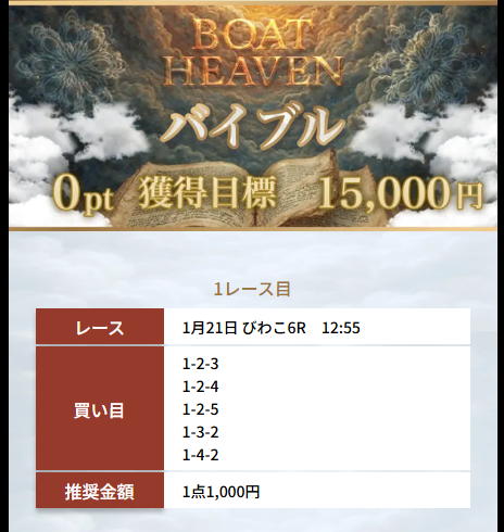 ボートヘブンのミカエルは、情報料30万円、獲得目標300万円の通常プランだ。