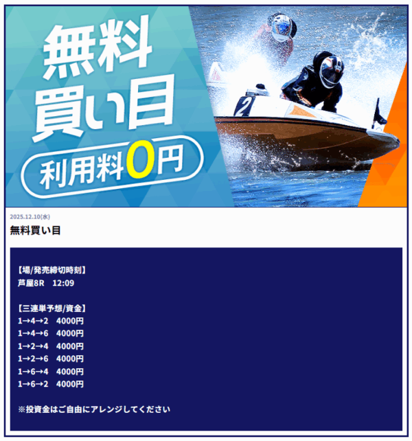 | 2025年12月8日 | 無料予想 | 340,400円 |