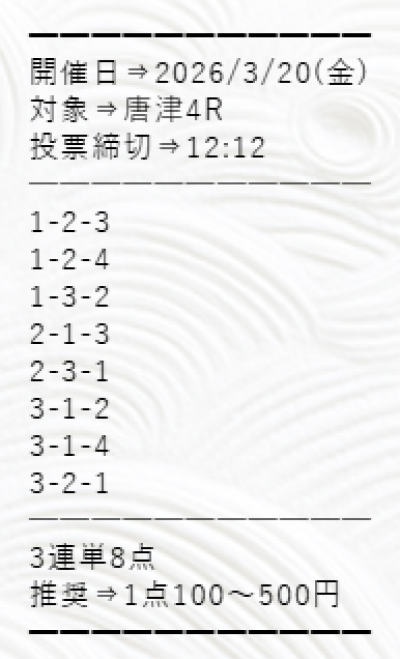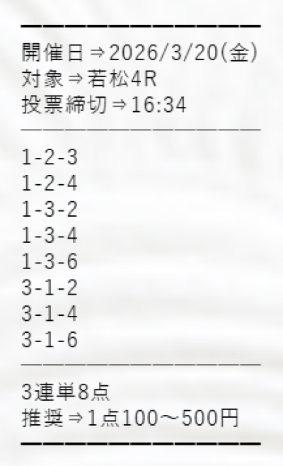 | 2026年3月20日 | 無料予想 | 5,450円 |