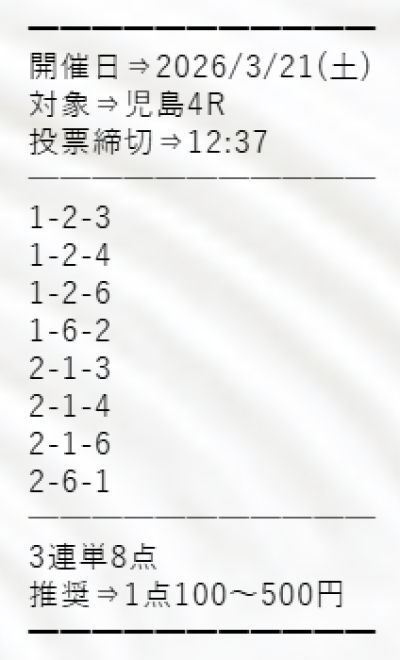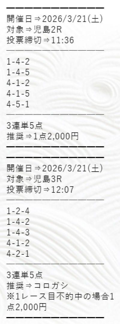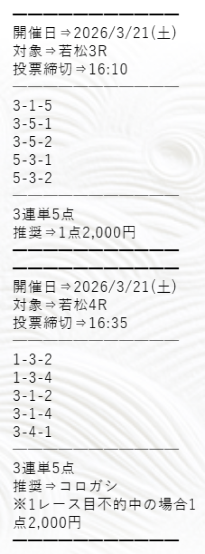 | 2026年3月21日 | 無料予想 | 4,800円 |
