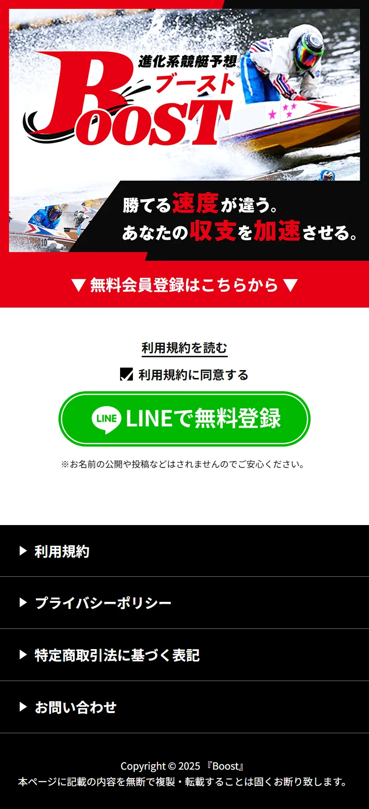競艇ブーストには、下のボタンの登録ページからLINEの友だち追加で無料会員登録できる。