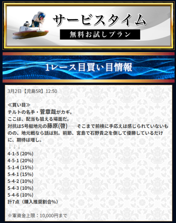 | 2024年7月9日 | 無料予想 | 50,000円 |