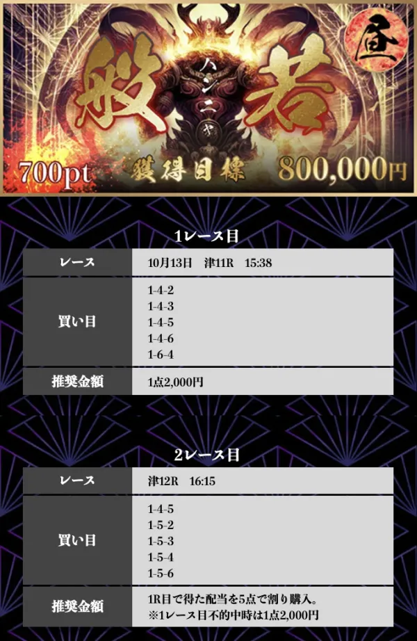観音は、情報料4万円(400pt)、獲得目標50万円の2レースコロガシプランとなっている。