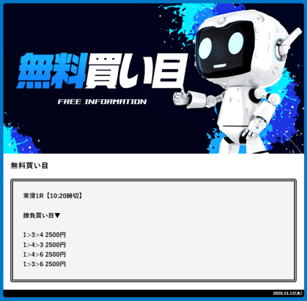 - 2025年11月13日に無料予想で20,500円の的中!