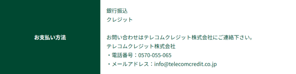 | お支払い方法 | 銀行振込 クレジット お問い合わせはテレコムクレジット株式会社にご連絡下さい。 テレコムクレジット株式会社 ・電話番号:0570-055-065 ・メールアドレス:info@telecomcredit.co.jp |