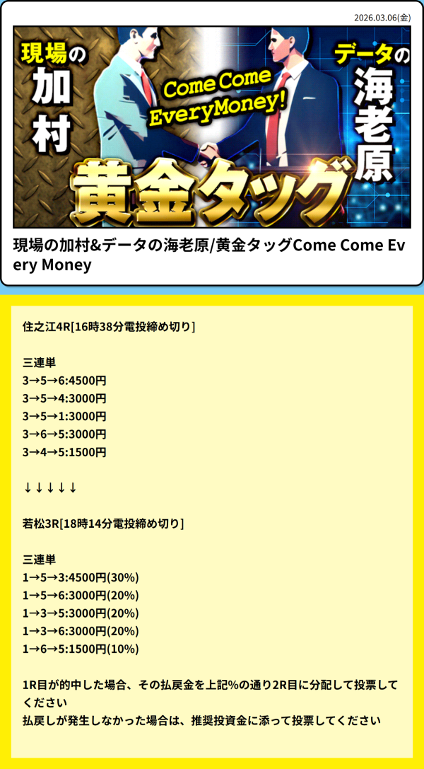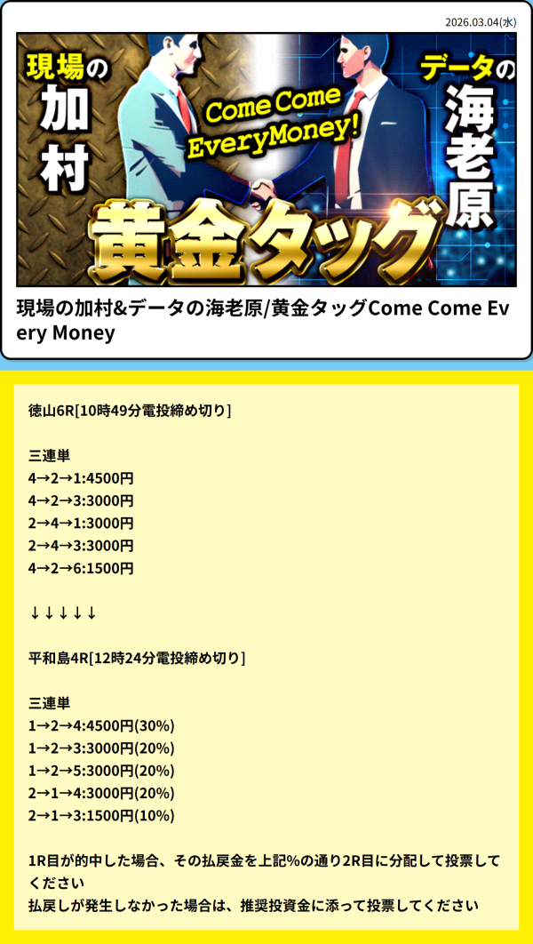 現場の加村&データの海老原/Come Come Every Moneyは、情報料25,000円のレギュラー情報だ。