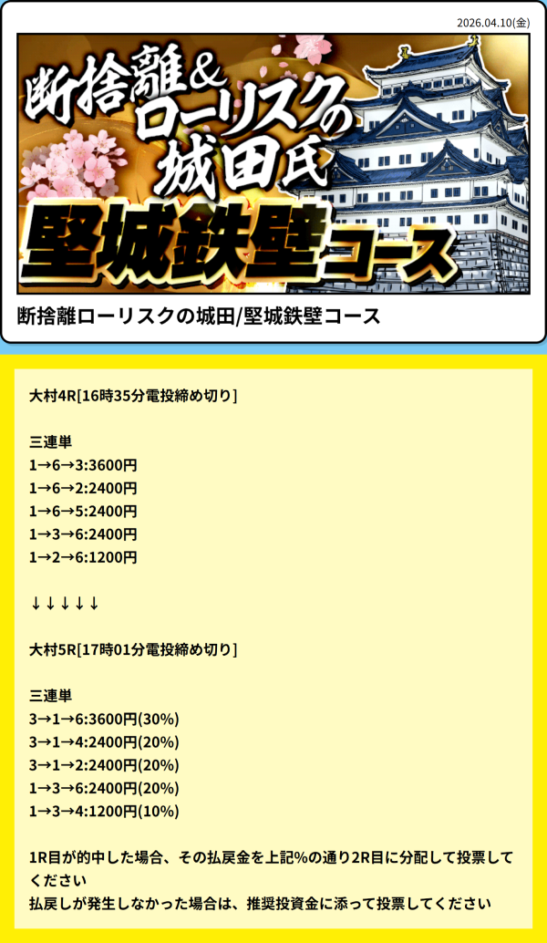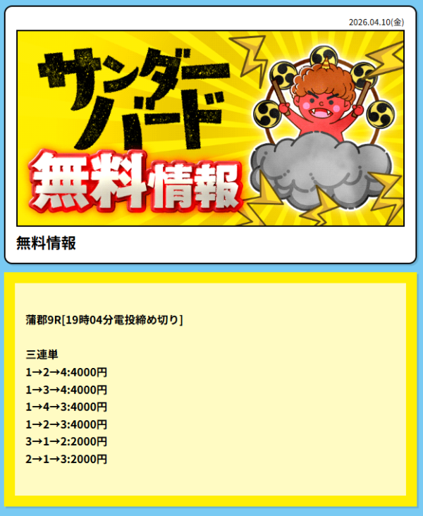 単発3レースの買い目が提供されるので、舟券をあらかじめ買っておけるのは使いやすいぞ。