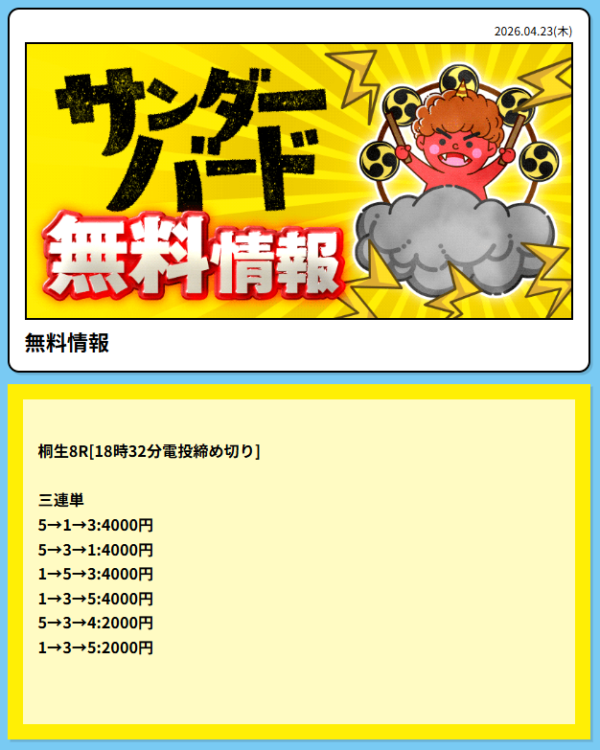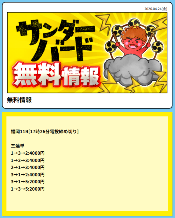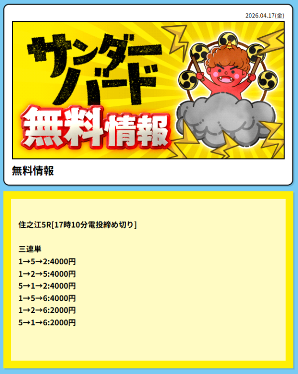 競艇サンダーバードの有料予想について、毎週公開レギュラー情報の情報料などをまとめた。