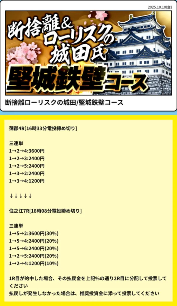 競艇サンダーバードの断捨離ローリスクの城田/堅城鉄壁コースは、情報料17,800円のプランだ。