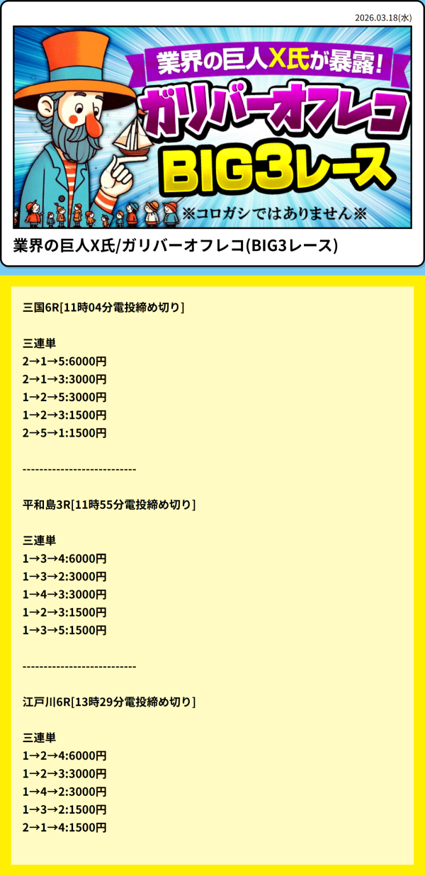 業界の巨人X氏/ガリバーオフレコ(BIG3レース)は、情報料33,000円のレギュラー情報だ。