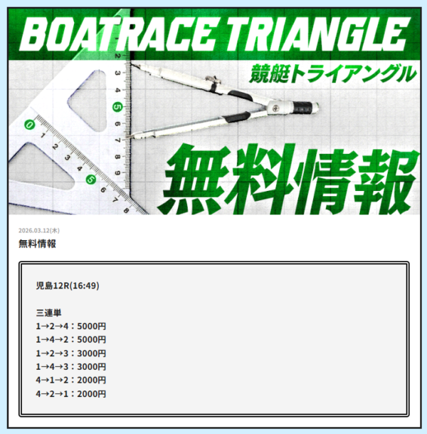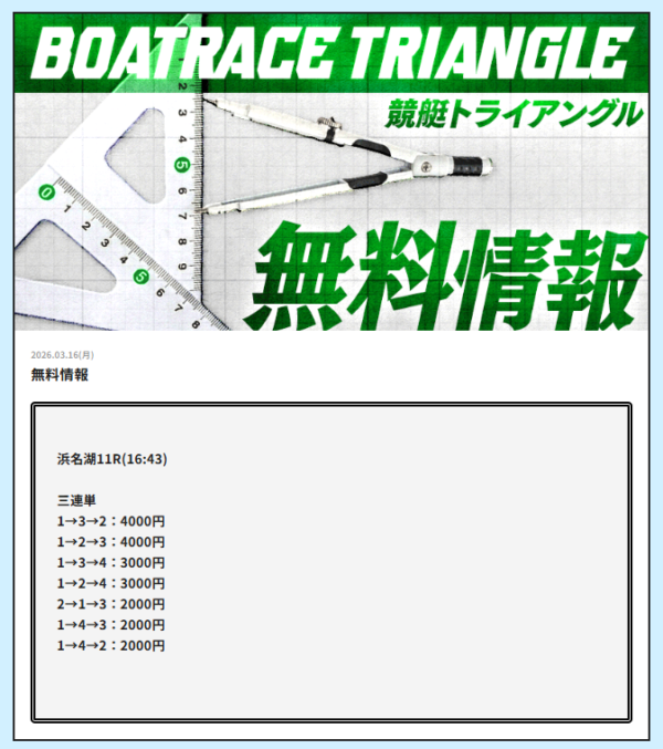 競艇トライアングル(TRIANGLE)は、2026年2月上旬に優良な競艇予想サイトと評価した。