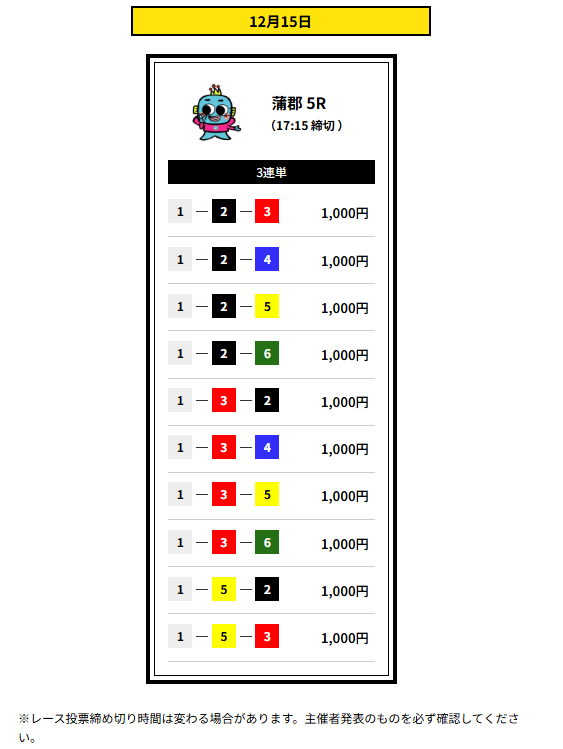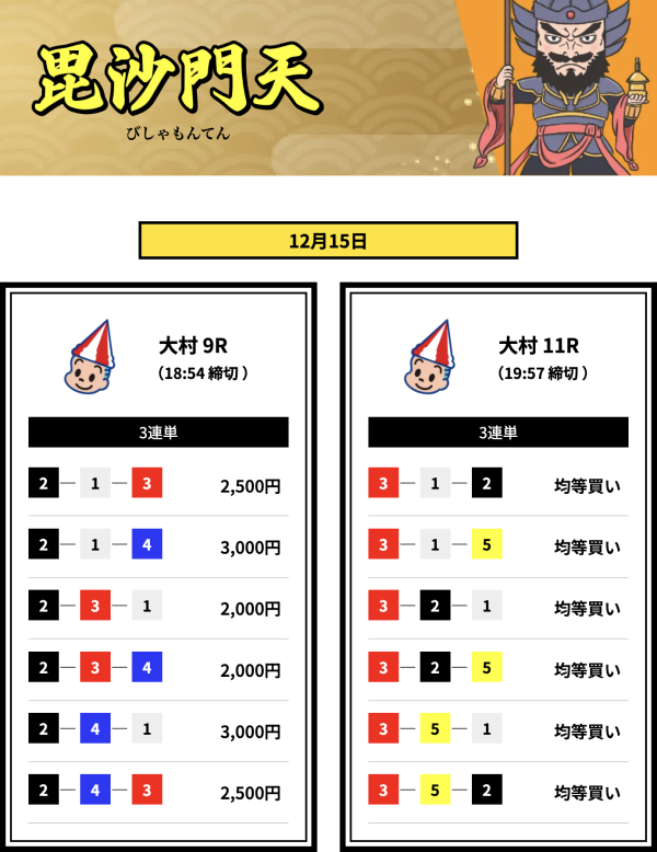 | 2025年12月15日 | 無料予想 | 5,000円 |