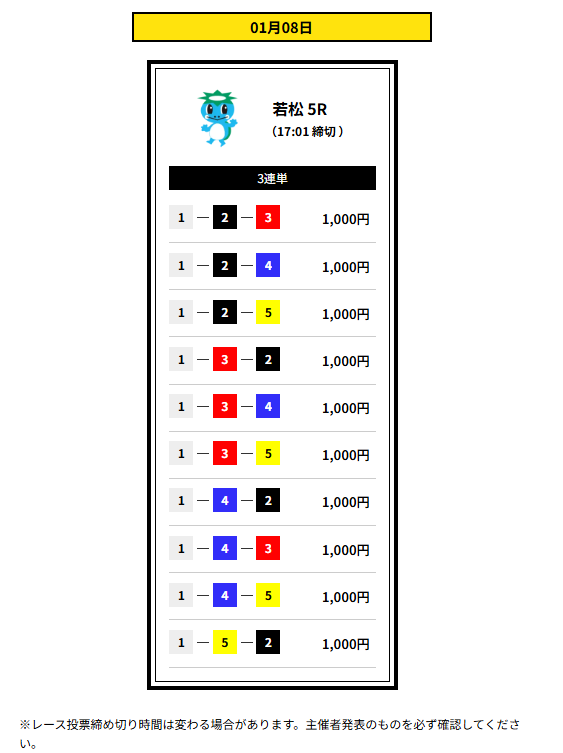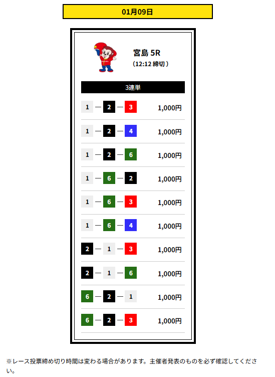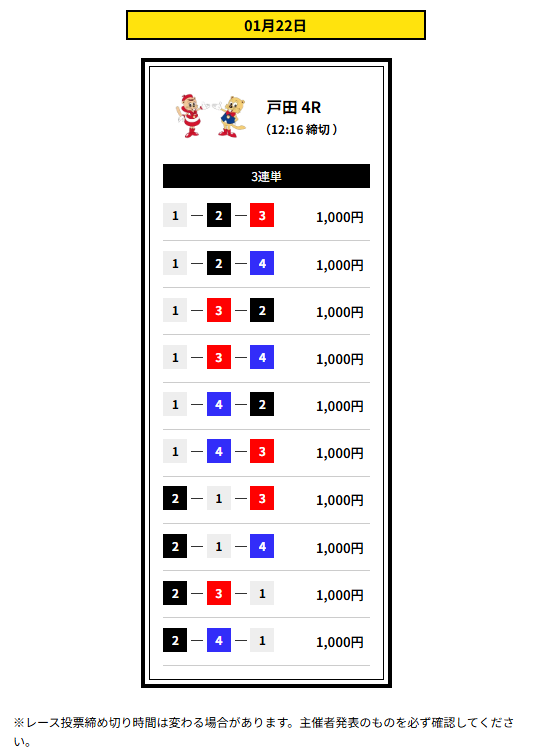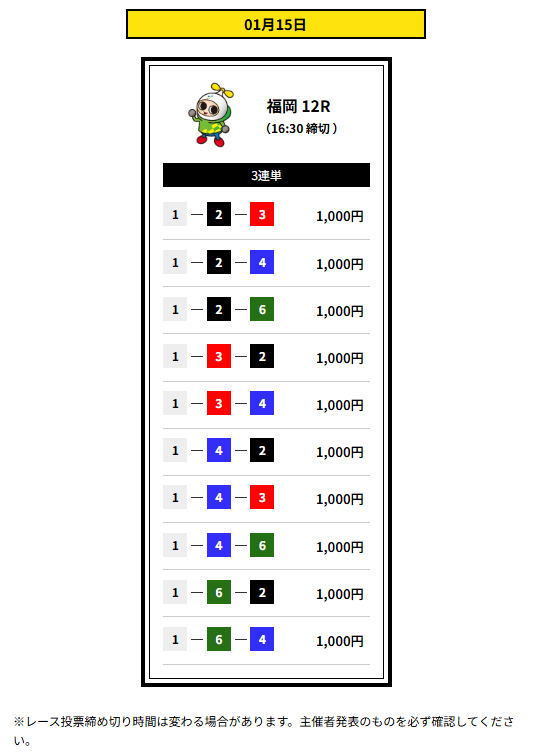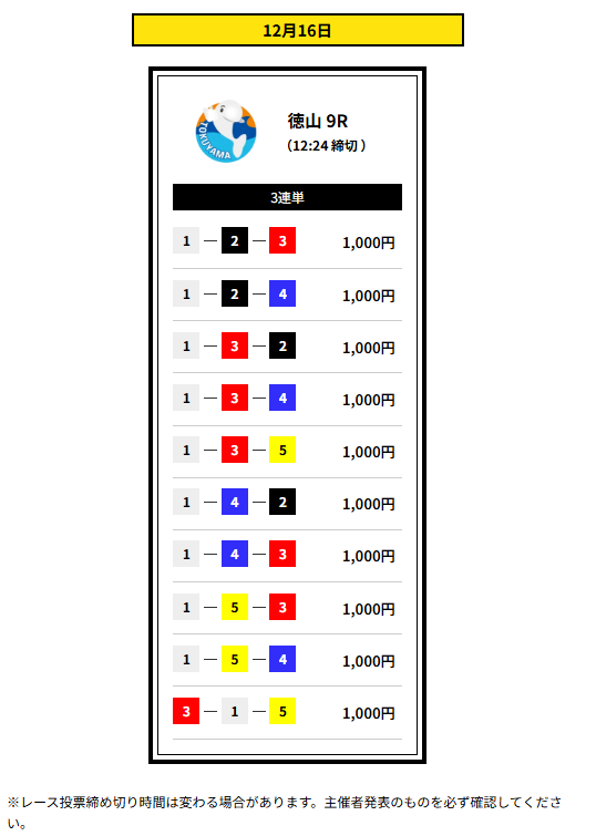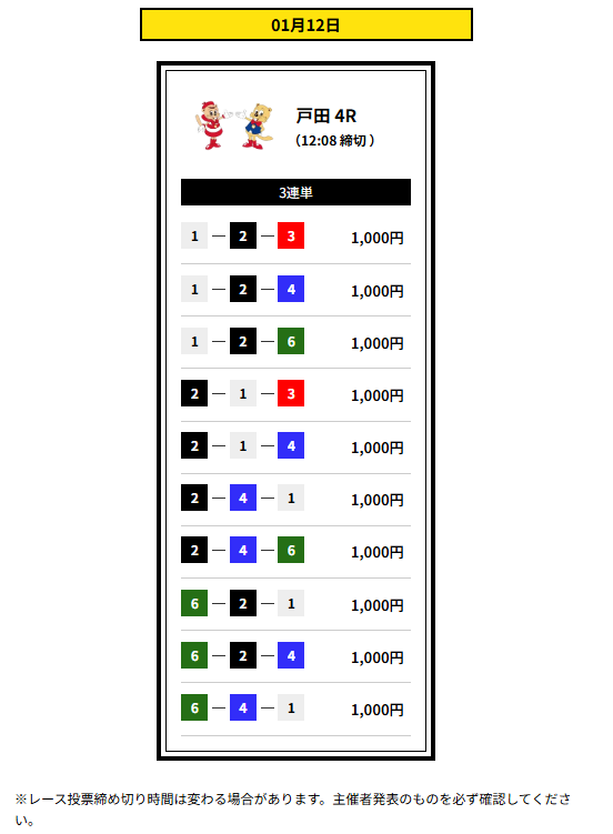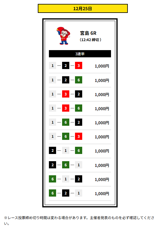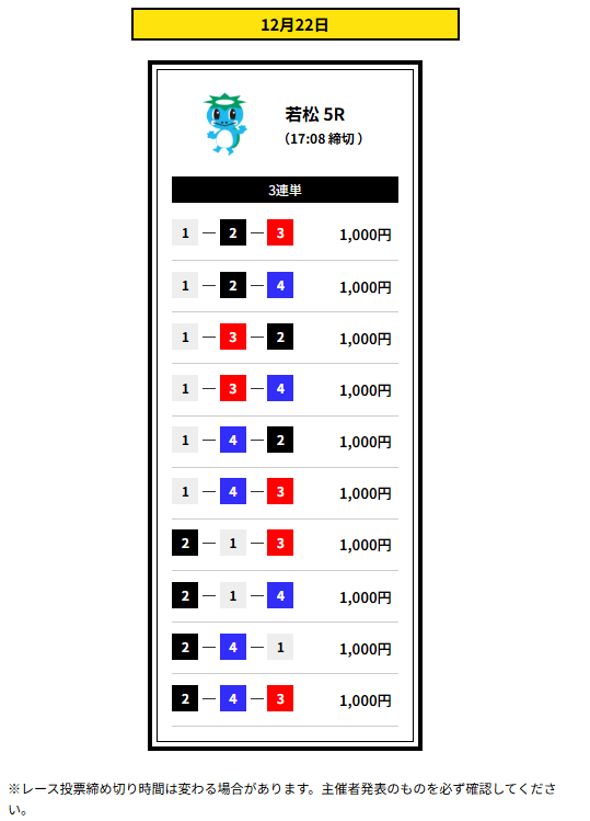 | 締め切り時間 | デイ 12:30 ナイター16:30 |