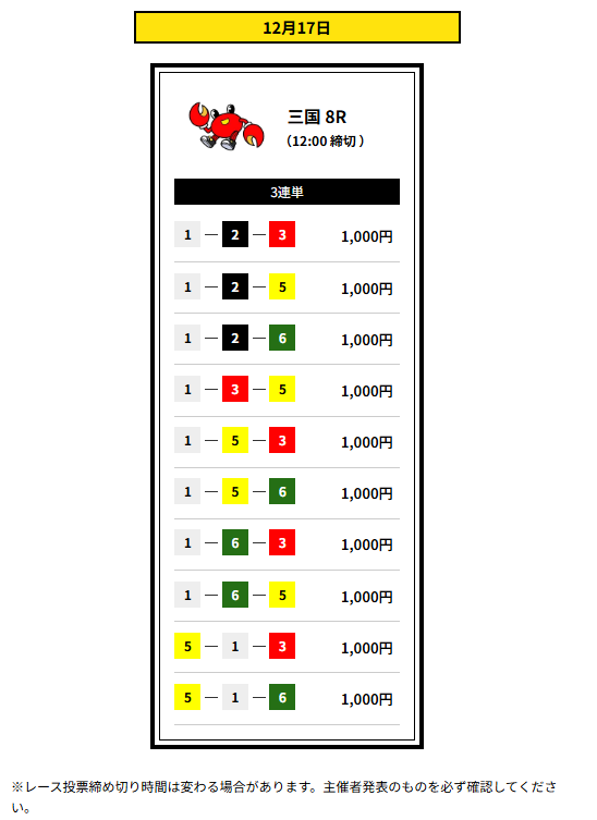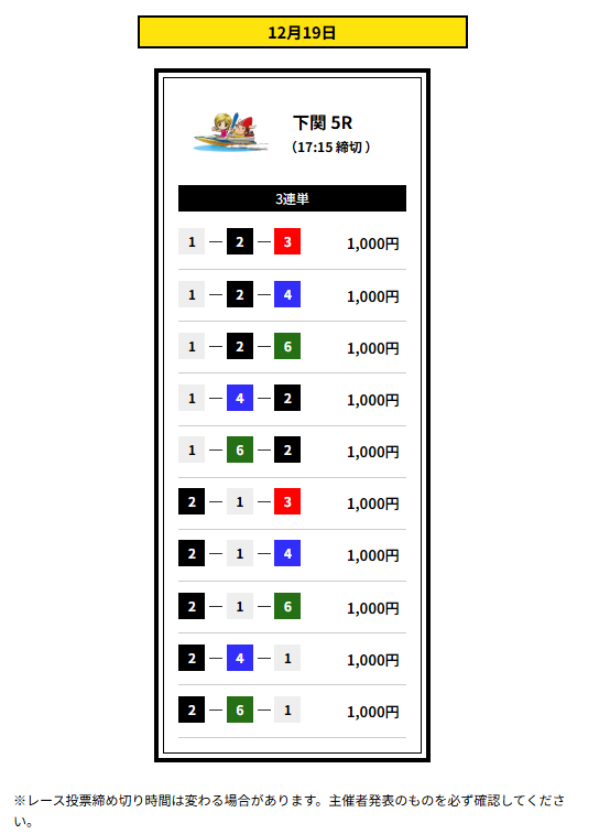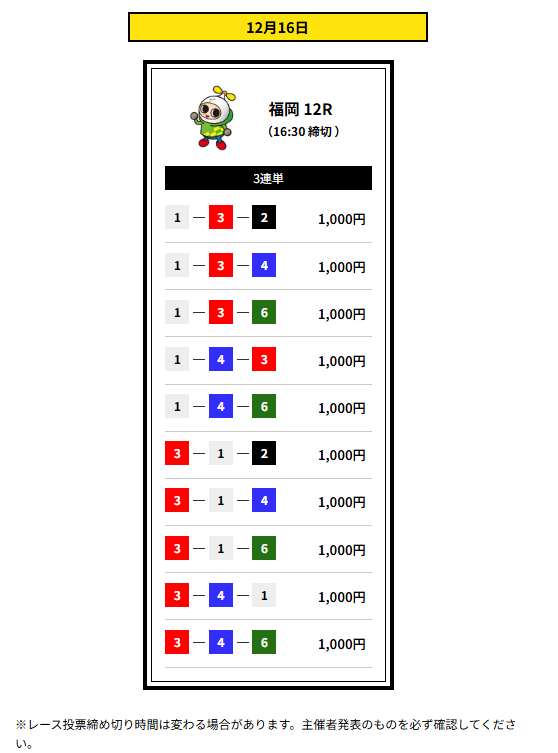 | 2025年12月16日 | 無料予想 | 11,900円 |