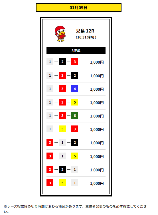 | 2026年1月9日 | 無料予想 | 10,500円 |