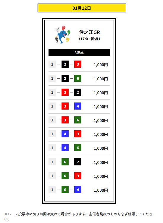 | 2026年1月12日 | 無料予想 | 107,600円 |