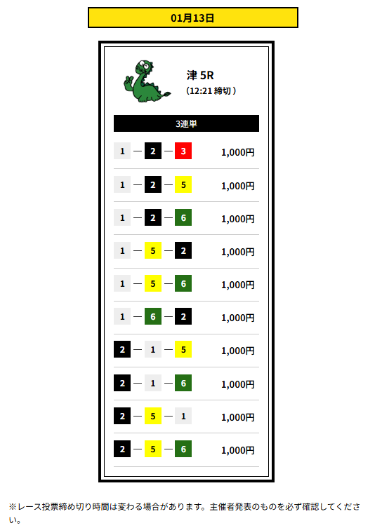| 2026年1月13日 | 無料予想 | 12,000円 |