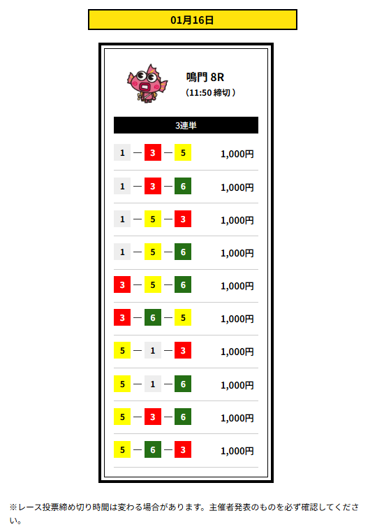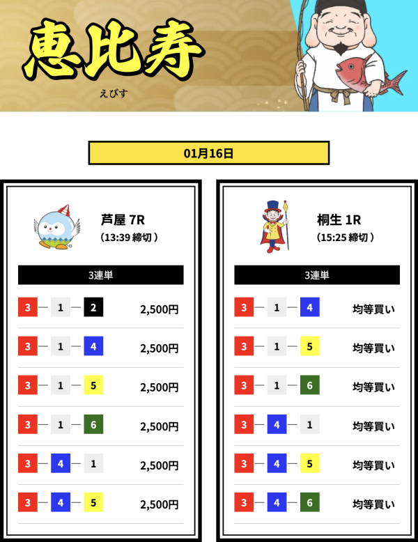 | 2026年1月16日 | 無料予想 | 8,100円 |