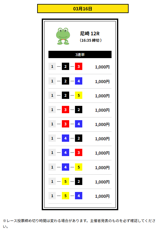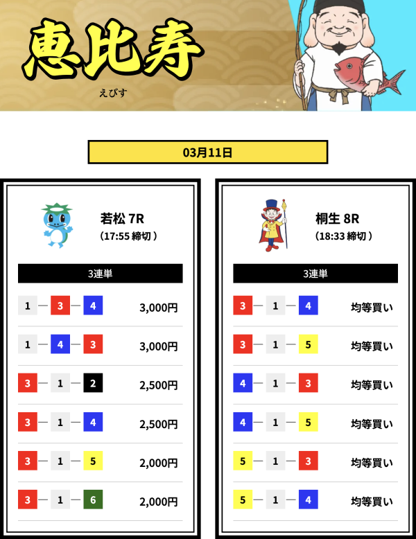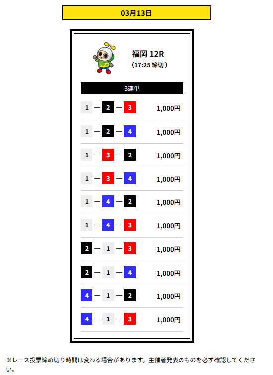 | 2026年3月12日 | 無料予想 | 3,600円 |