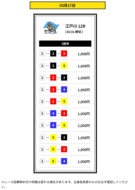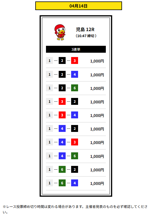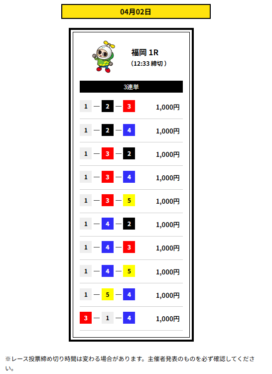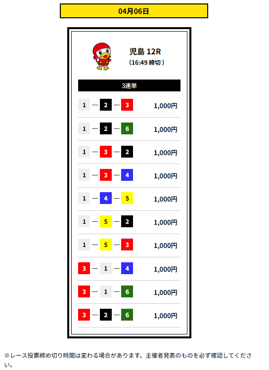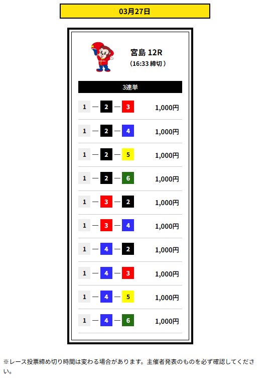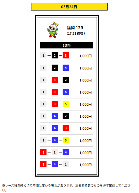| 締め切り時間 | デイ 12:30 ナイター16:30 |