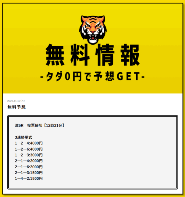 | 2025年11月10日 | 無料予想 | 21,200円 |