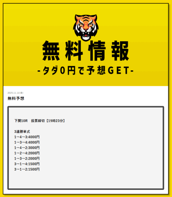 | 2025年11月14日 | 無料予想 | 23,600円 |