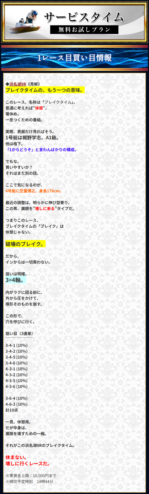 自分でも買い目を検討して、買い目に納得できる時やオッズが高い時だけ乗っかってみてくれ。